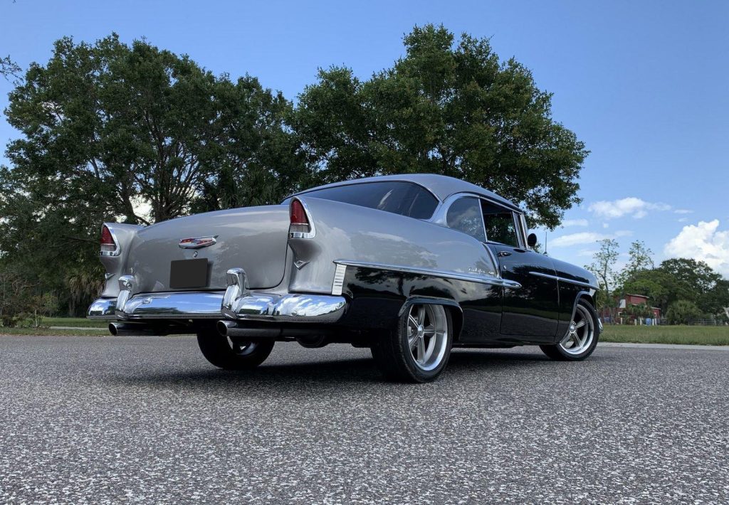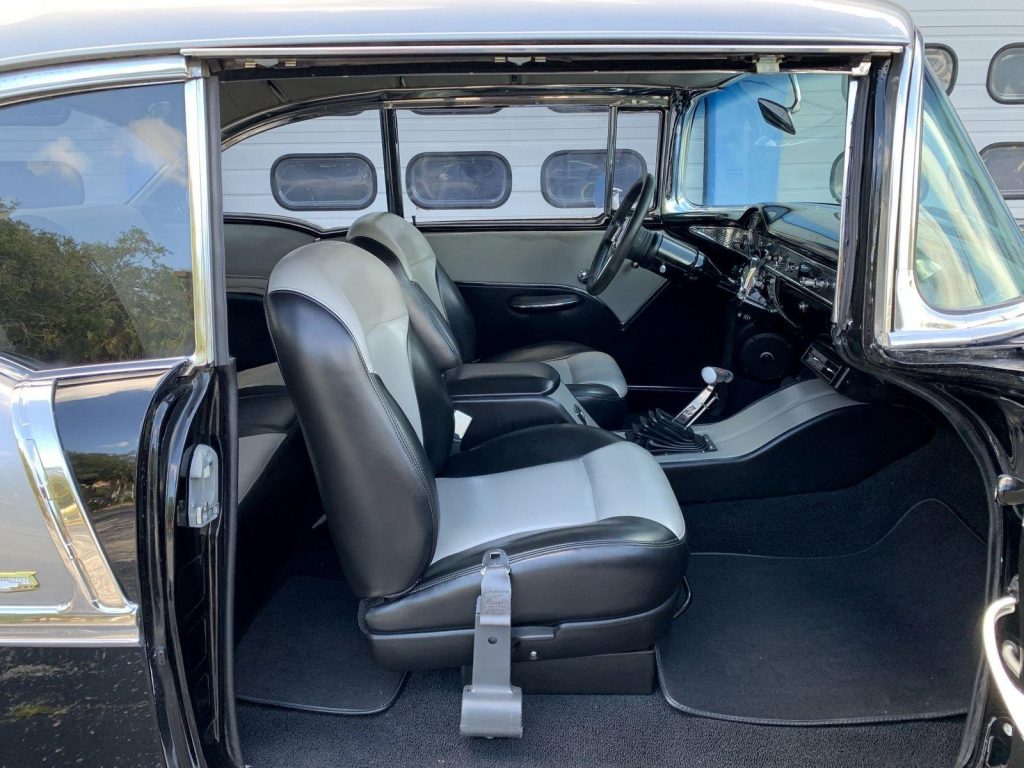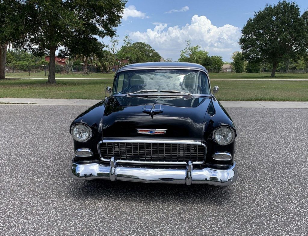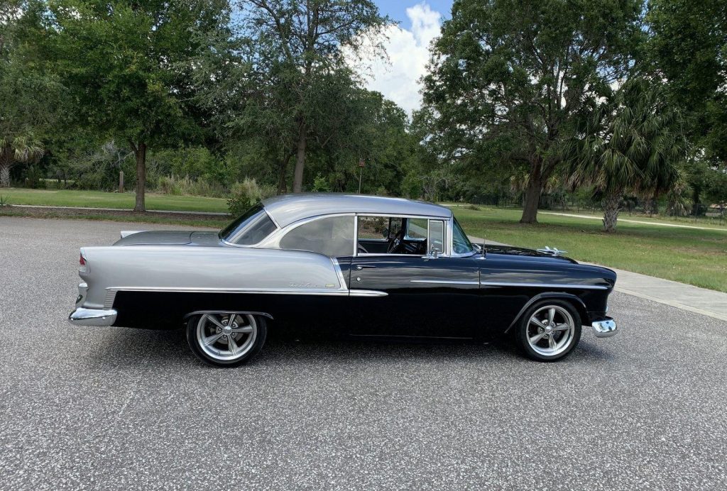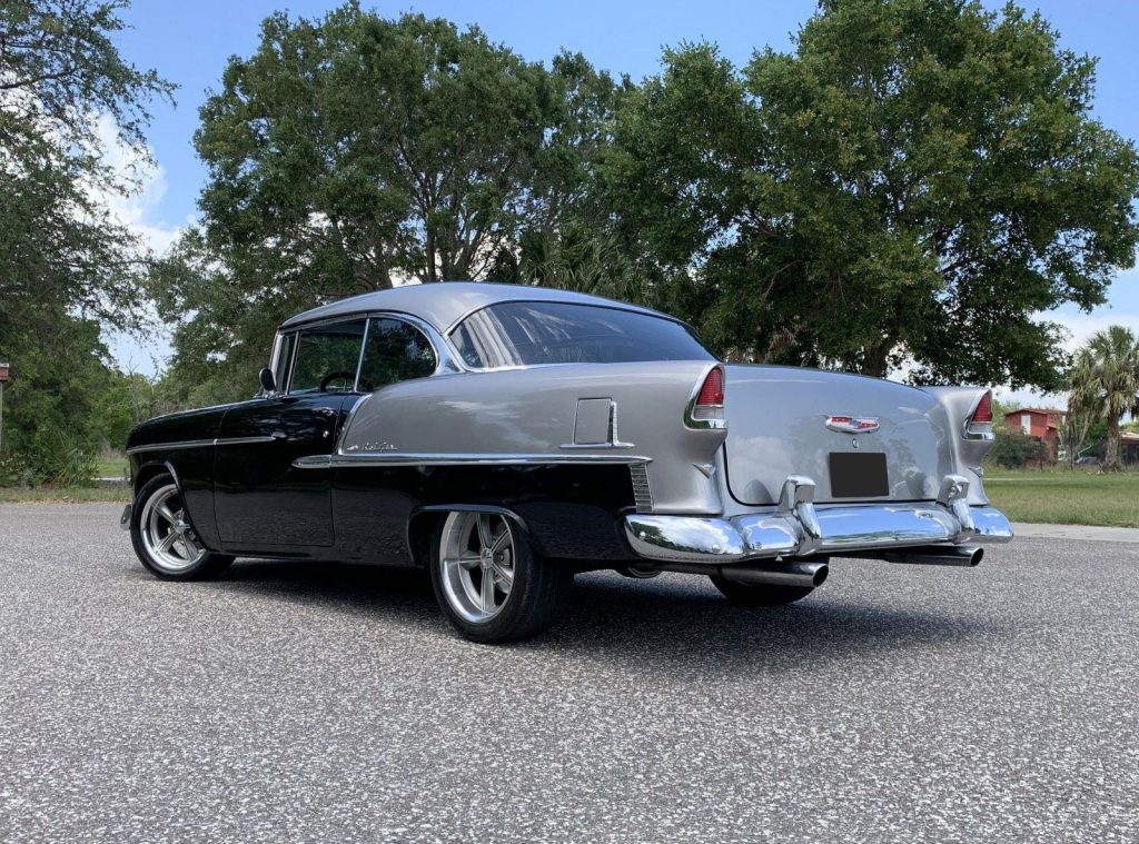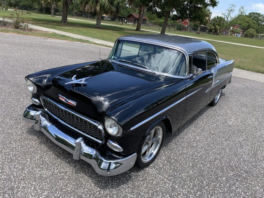 We are pleased to offer this 1955 Chevrolet Bel Air Hardtop for Sale. True VC Code Bel Air. 5.7L V8 Vortech engine (casting number 10243880), 700R4 automatic overdrive transmission, air conditioning, Quick Fuel 4 barrel carburetor, Edelbrock aluminum intake, HEI electronic ignition, Sanderson Headers, dual exhaust, polished aluminum engine accessories, serpentine belt system, chrome plated radiator support, Griffin aluminum radiator with twin electric fans, 4 wheel power disc brakes, rack and pinion power steering, front adjustable shocks, updated fuse box and electrical system, beautiful black and silver exterior, 17” ION 625 Series alloy wheels with Hankook Tires, dual chrome sport mirrors, tinted glass, front power windows, custom gray and black bucket seat interior with driver’s power seat, custom console, B&M Shifter, tilt steering column, Classic Instruments Gauge package, Newport Engineering upgraded wiper motor, AM/FM radio.