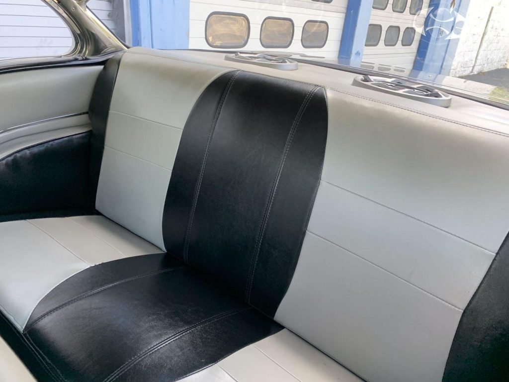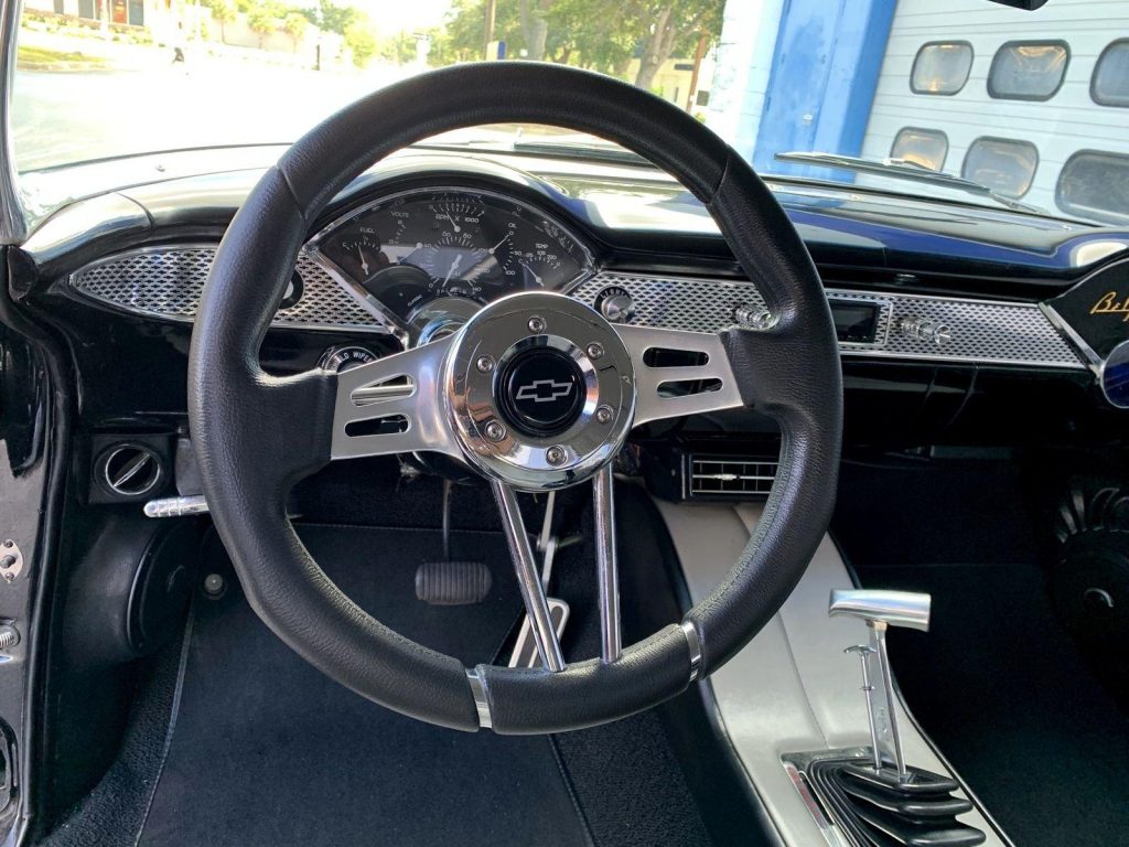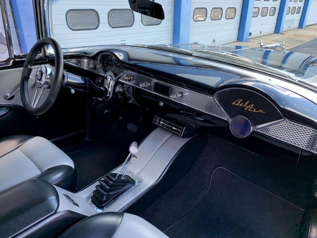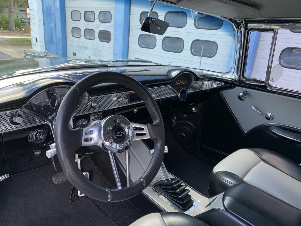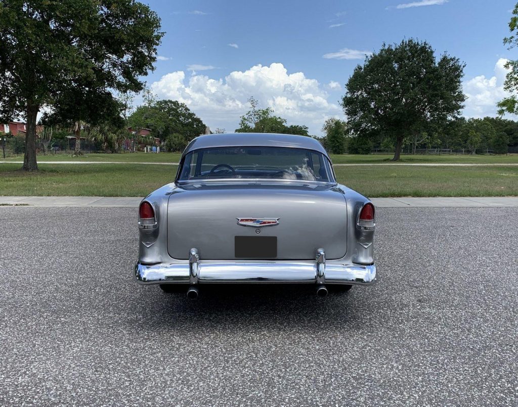 We are pleased to offer this 1955 Chevrolet Bel Air Hardtop for Sale. True VC Code Bel Air. 5.7L V8 Vortech engine (casting number 10243880), 700R4 automatic overdrive transmission, air conditioning, Quick Fuel 4 barrel carburetor, Edelbrock aluminum intake, HEI electronic ignition, Sanderson Headers, dual exhaust, polished aluminum engine accessories, serpentine belt system, chrome plated radiator support, Griffin aluminum radiator with twin electric fans, 4 wheel power disc brakes, rack and pinion power steering, front adjustable shocks, updated fuse box and electrical system, beautiful black and silver exterior, 17” ION 625 Series alloy wheels with Hankook Tires, dual chrome sport mirrors, tinted glass, front power windows, custom gray and black bucket seat interior with driver’s power seat, custom console, B&M Shifter, tilt steering column, Classic Instruments Gauge package, Newport Engineering upgraded wiper motor, AM/FM radio.