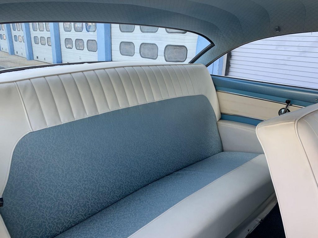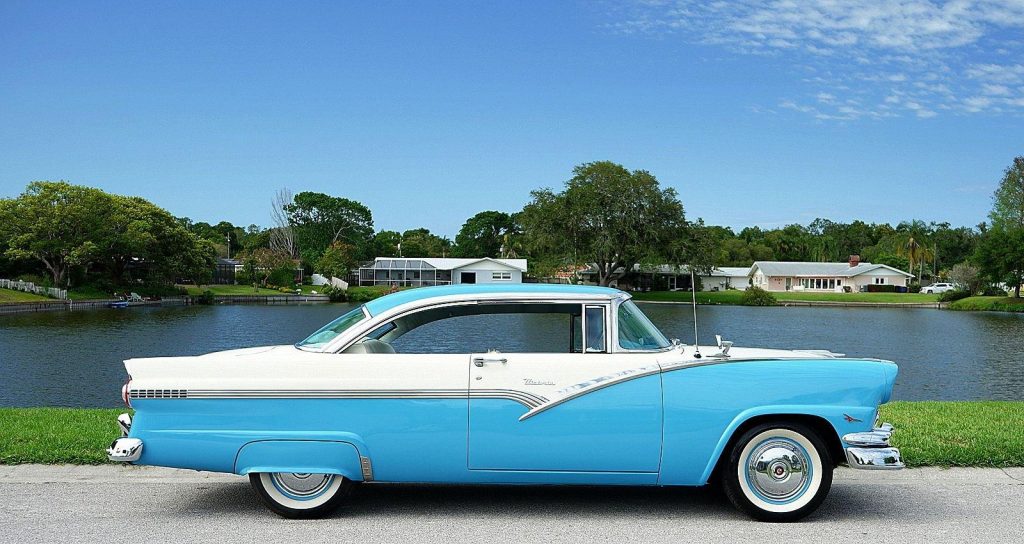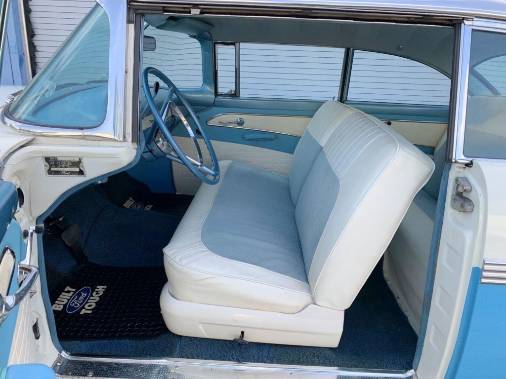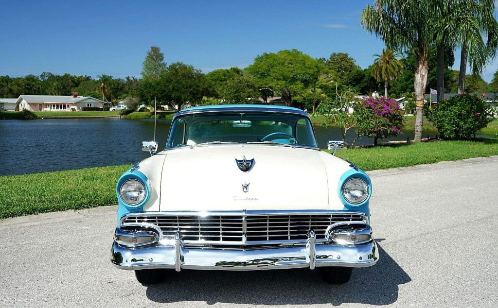 We are pleased to offer this 1956 Ford Victoria Hardtop finished in striking Bermuda Blue and Colonial White. It’s powered by a 292 Y-Block V8 with dual 2-barrel carbs, a custom one-of-a-kind air cleaner, and polished Thunderbird valve covers, paired with an automatic transmission and dual exhaust through the bumper tips. This Victoria features a 12-volt electrical system, power front disc brakes, and 15” painted steel wheels with wide whitewall radial tires and hubcaps. The classy interior offers white vinyl with blue cloth inserts, padded dash, and a Retrosound AM/FM radio. With cruise skirts and clean 1950s styling, this is a true classic ready to enjoy. Call us today!