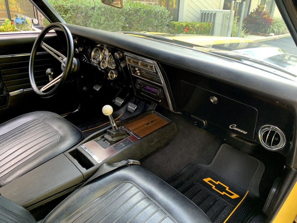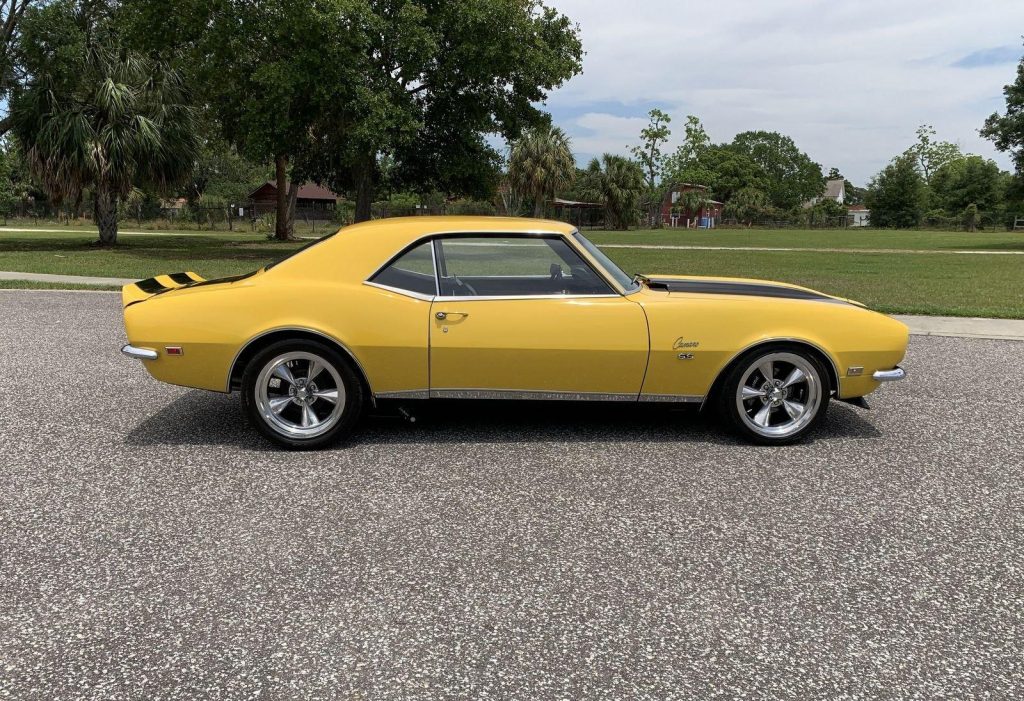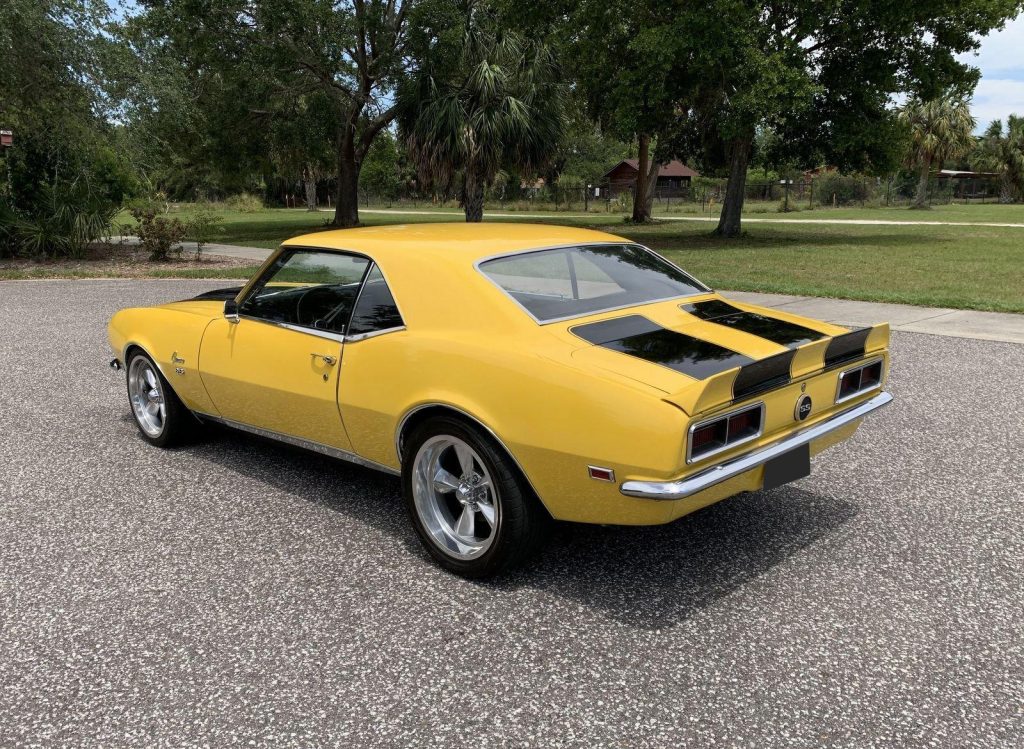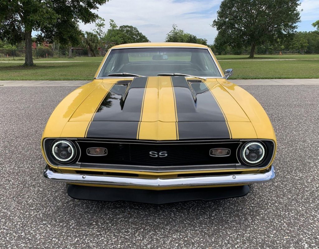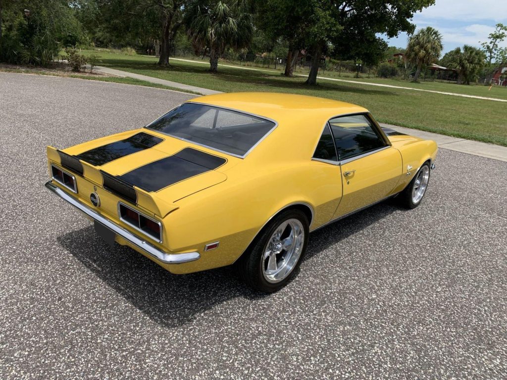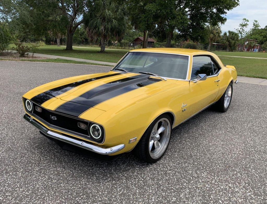 We are pleased to offer this 1968 Chevrolet Camaro Restomod for Sale. 454 Cu In V8 engine, 14096188 casting number GM Hi-Performance square port heads, roller rocker, Holley 4-barrel carburetor, MSD electronic ignition, aluminum intake, aluminum radiator, serpentine belts, cold air conditioning, detailed engine bay and undercarriage, lots of chrome accessories under the hood, ceramic coated headers, dual exhaust, Tremec 5-Speed manual transmission, 12 bolt rear, tubular front control arms, sub frame connectors, Cal Tracs traction bars, Wilwood Power Disc Brakes, 18” US Mag U108 Wheels, refinished in Corvette Millenium Yellow with black Rally Stripes, Cowl Hood, front lower valance and rear deck spoilers, halo headlights, driver’s chrome sport mirror, black bucket seat interior, Auto Meter Gauges, 3-spoke steering wheel, AM/FM/CD radio.