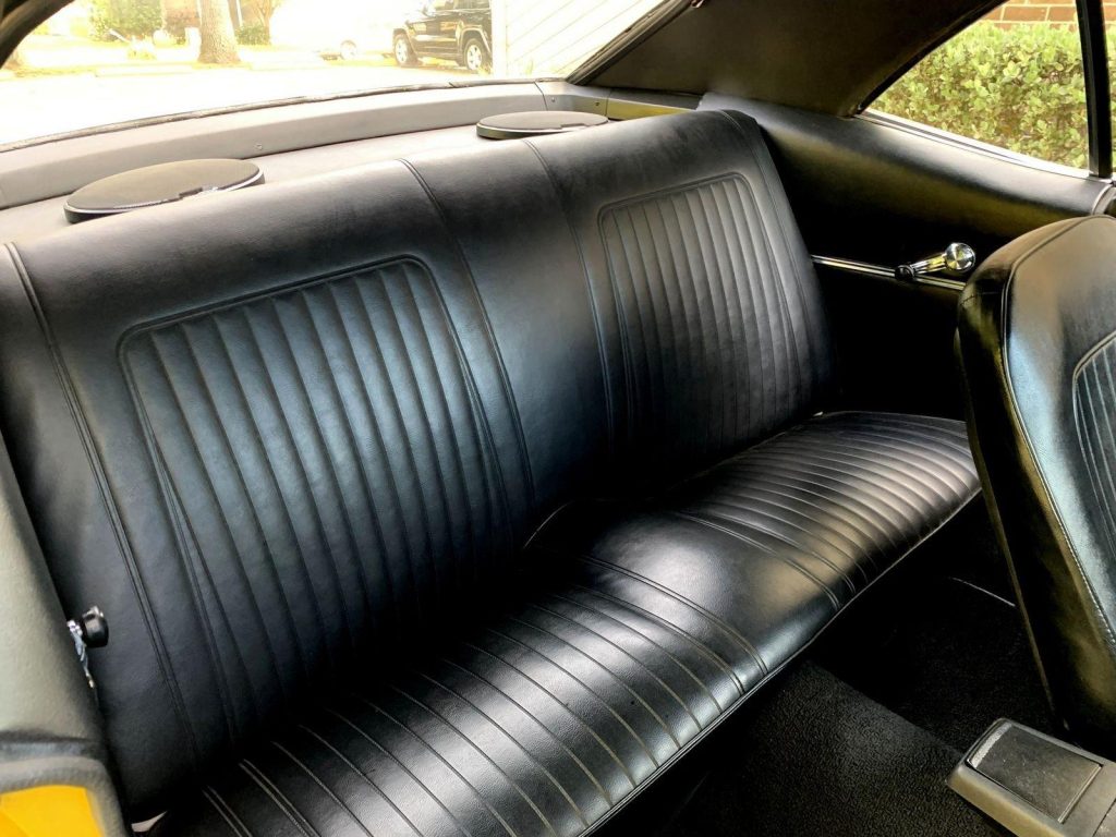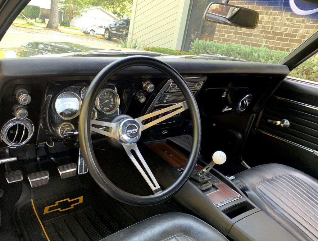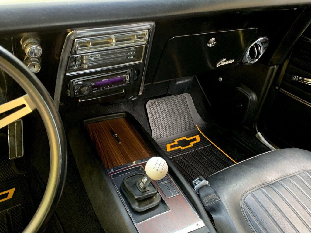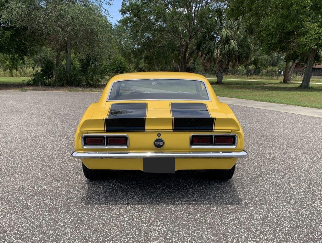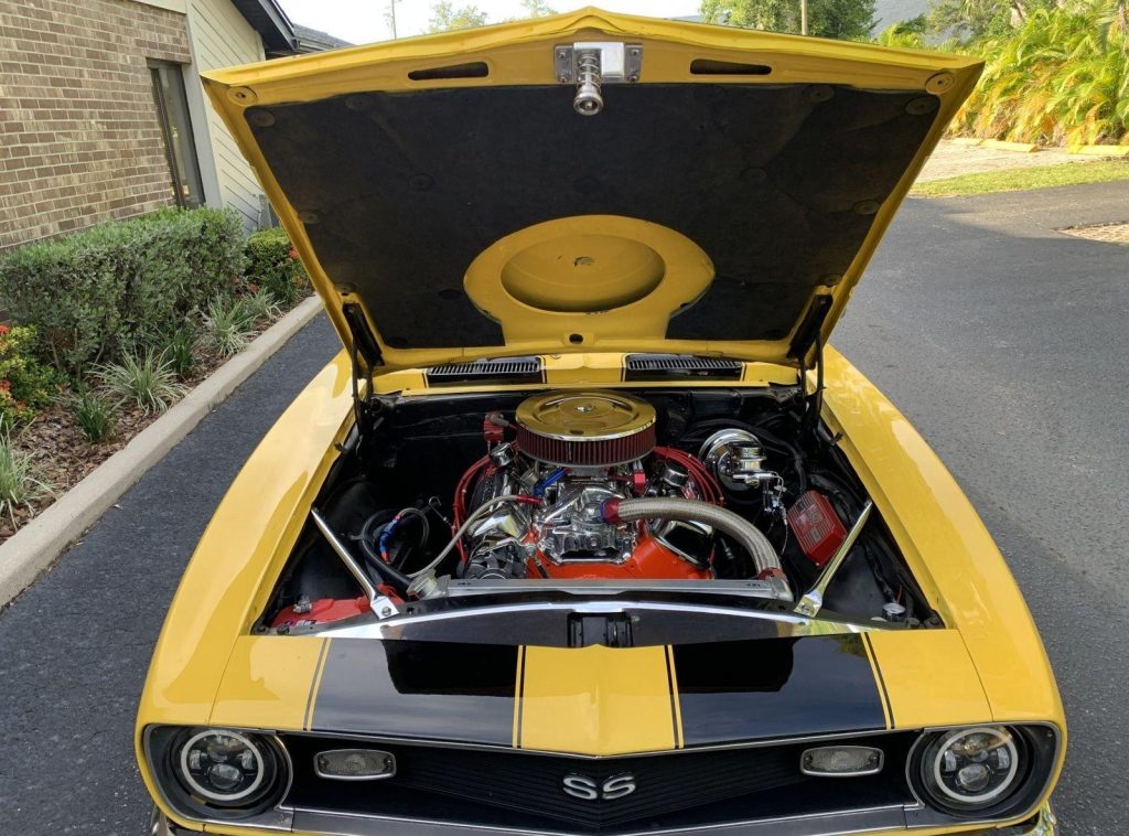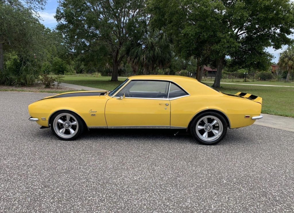 We are pleased to offer this 1968 Chevrolet Camaro Restomod for Sale. 454 Cu In V8 engine, 14096188 casting number GM Hi-Performance square port heads, roller rocker, Holley 4-barrel carburetor, MSD electronic ignition, aluminum intake, aluminum radiator, serpentine belts, cold air conditioning, detailed engine bay and undercarriage, lots of chrome accessories under the hood, ceramic coated headers, dual exhaust, Tremec 5-Speed manual transmission, 12 bolt rear, tubular front control arms, sub frame connectors, Cal Tracs traction bars, Wilwood Power Disc Brakes, 18” US Mag U108 Wheels, refinished in Corvette Millenium Yellow with black Rally Stripes, Cowl Hood, front lower valance and rear deck spoilers, halo headlights, driver’s chrome sport mirror, black bucket seat interior, Auto Meter Gauges, 3-spoke steering wheel, AM/FM/CD radio.