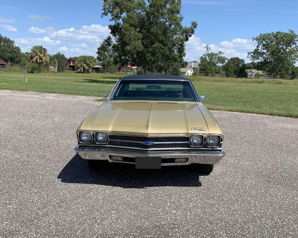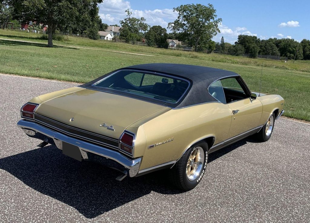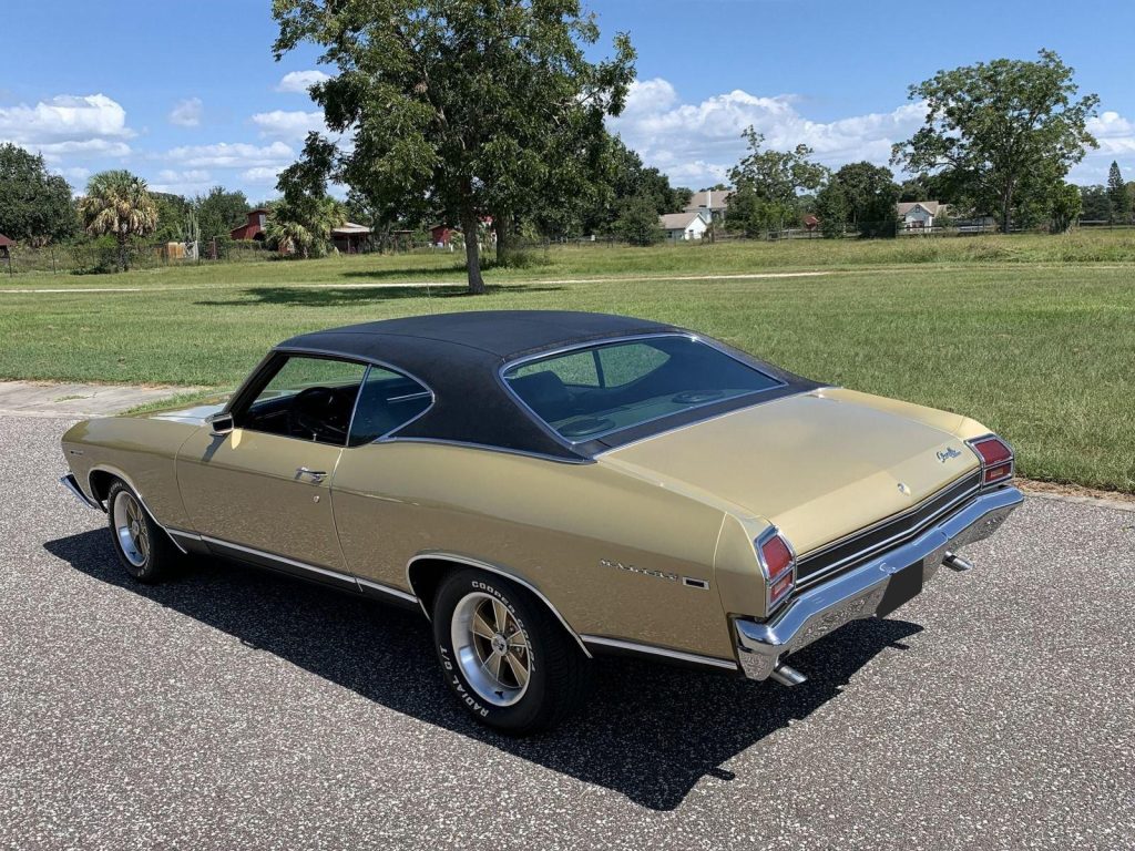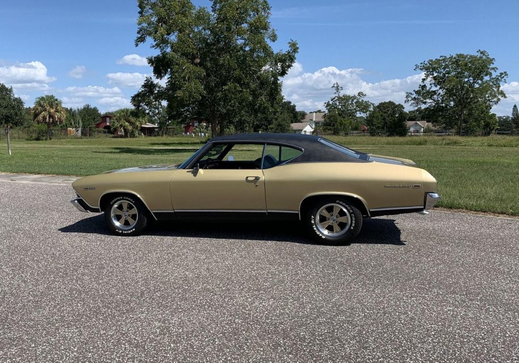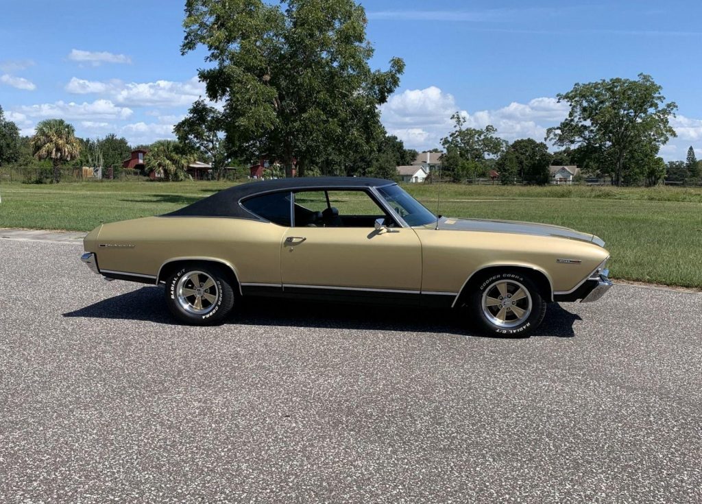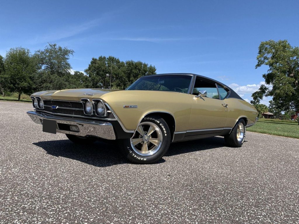 We are pleased to offer this 1969 Chevrolet Chevelle Malibu, showing 83,747 actual miles on the odometer. Powered by its numbers-matching 350 V8 with aluminum intake, Holley carburetor, HEI ignition, ceramic-coated headers, and dual exhaust, it’s paired with power steering, front power disc brakes, and air conditioning. The car rides on 15” Hurst wheels with Cooper Cobra white letter tires and is finished in Code 65 Olympic Gold with a black vinyl top and dual chrome sport mirrors.…
