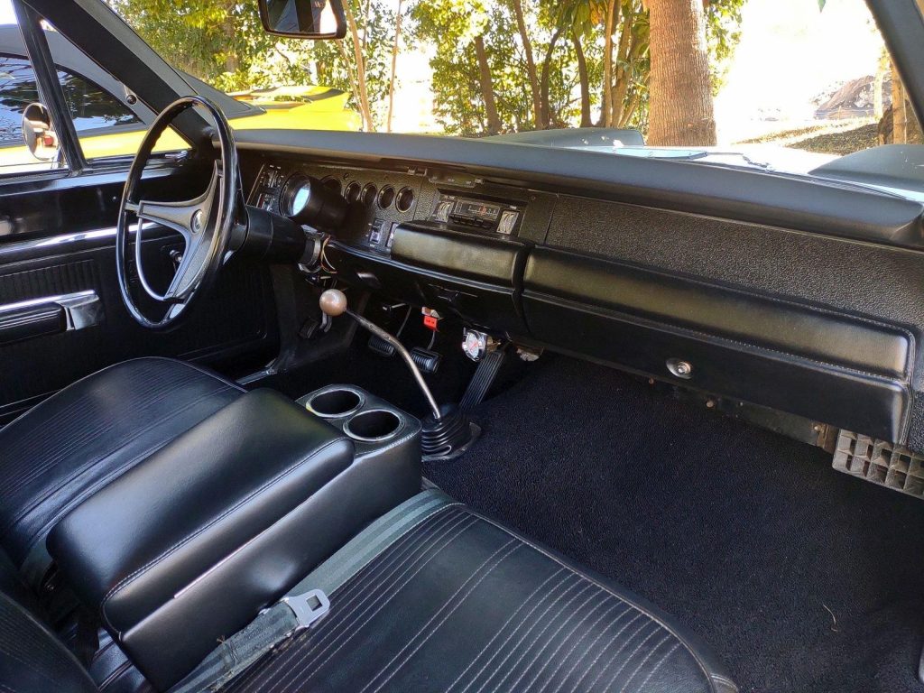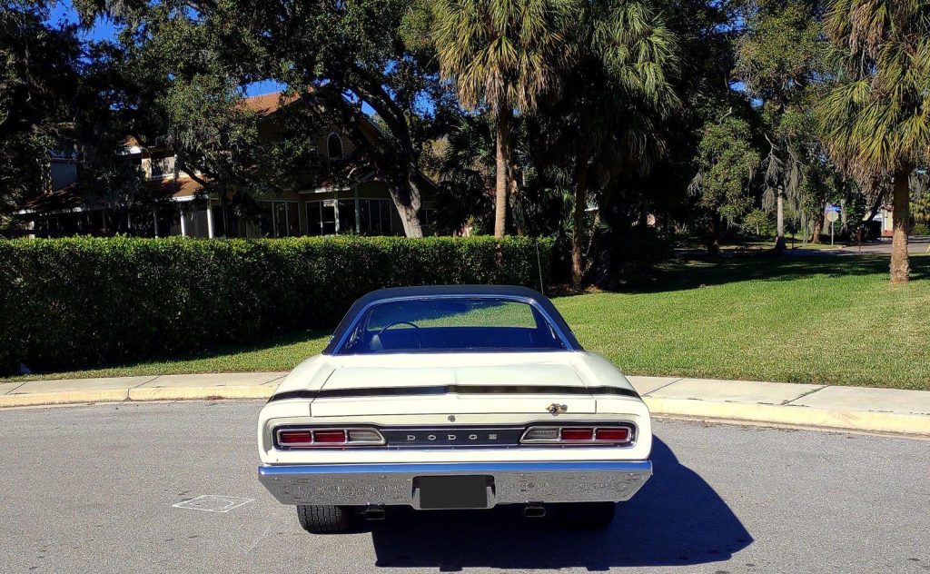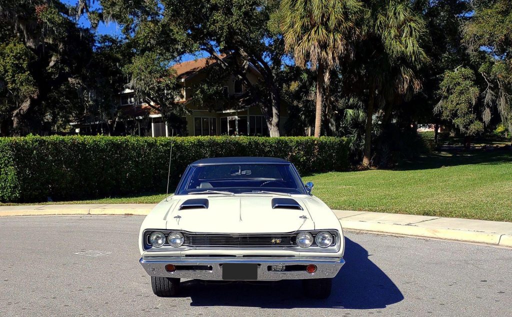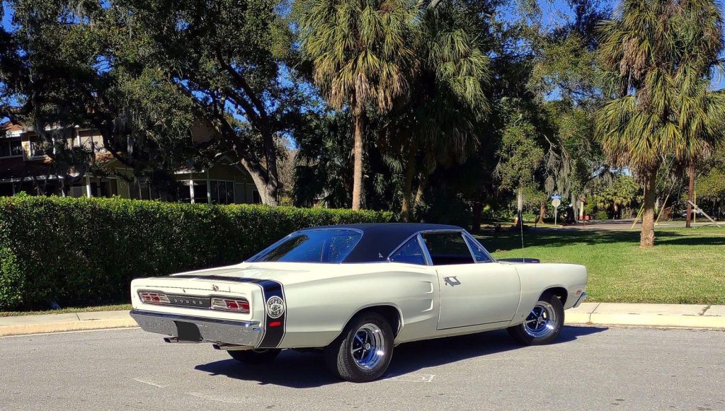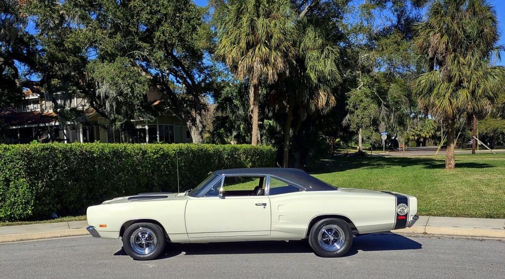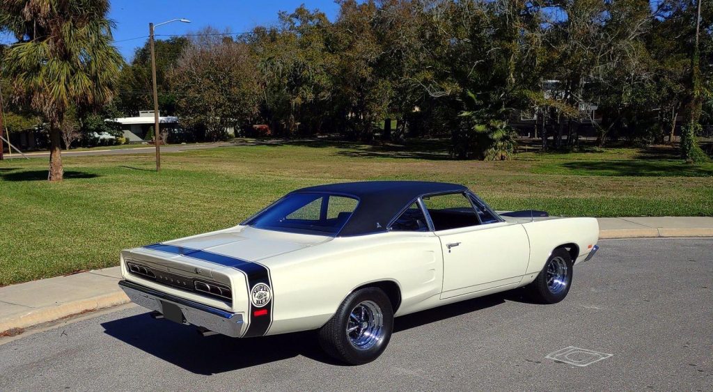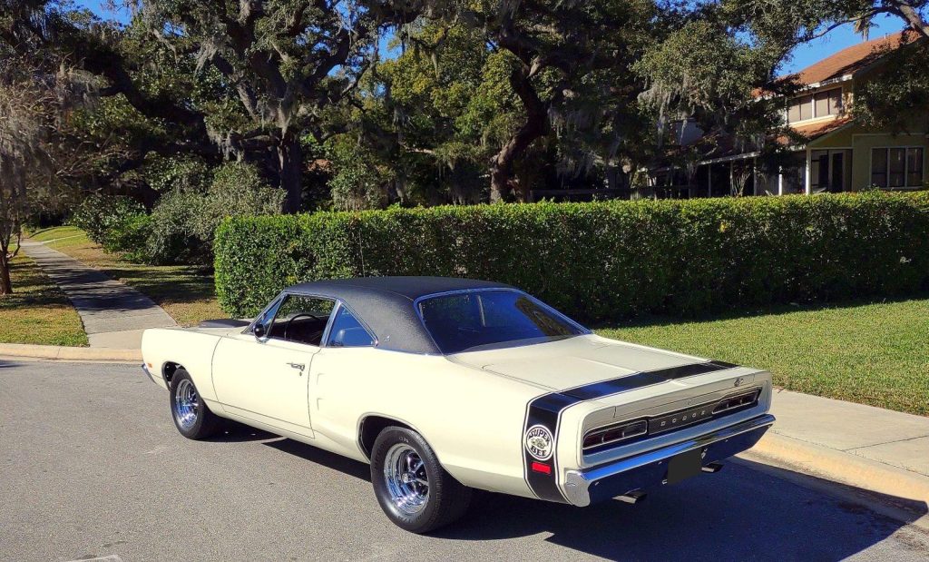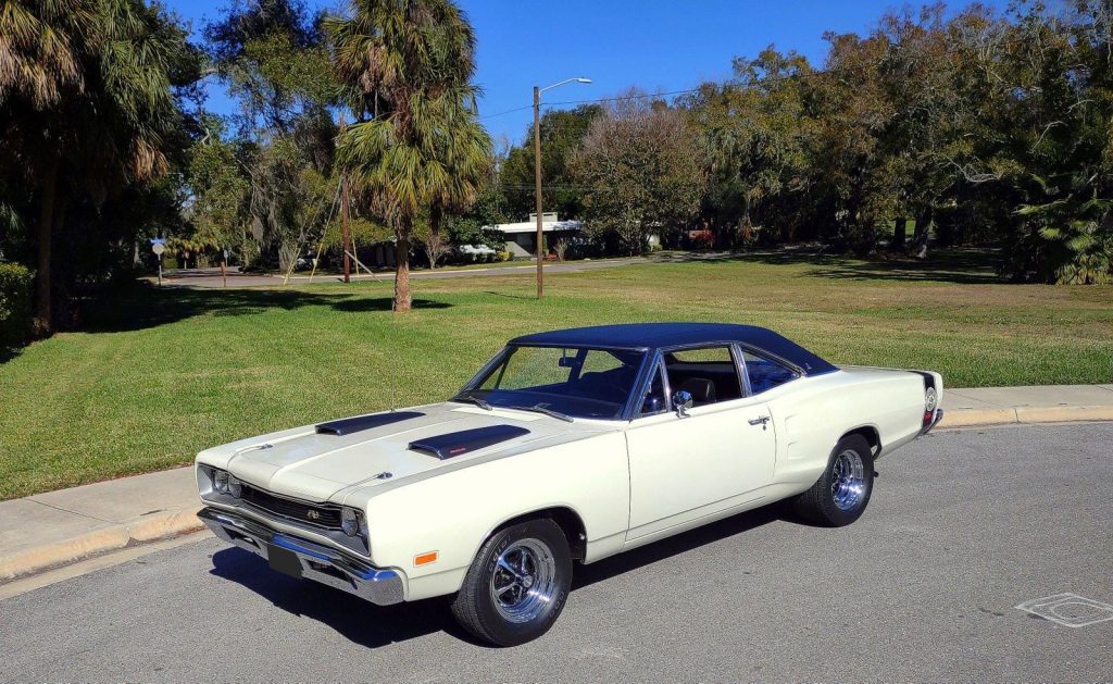 We are pleased to offer this 1969 Dodge Super Bee for Sale. Restored to reflect the EXCEPTIONAL Muscle Car seen here! During restoration, an upgrade was made to the power train with the insert of a 440 Cu In V8 into the highly detailed color keyed engine bay. The motor was professionally stroked to 493 Cu In with a fully balanced rotating assembly, Mopar Performance 509 hydraulic cam, Edelbrock aluminum heads, Holley Street Dominator Intake, topped with a Holley 950 HP carb, Mopar Performance valve covers and TTI Headers with a 3″ TTI X-Pipe exhaust. This is mated to an A833 4 speed manual transmission with Hurst Shifter and Centerforce dual friction clutch. The power is put to the ground through a set of 3:55.1 gears. This Super Bee is finished in it’s Correct Code W1 White with a contrasting black vinyl top, scooped hood with functional Ram Air controls. The exterior is further accented by Dodge’s famous “Bumble Bee” stripe package around the rear end of the car making it a member of Dodge’s “SCAT PACK” group. The correct black bench seat interior remains stock and has an AM radio. The trunk is finished to show quality standards. The car has plenty of “Get Up and Go,” and the stopping is provided by the addition of front disc brakes. The car rolls on a set of Magnum 500’s carrying BF Goodrich radials, 245/60R 15’s on the front and a larger 295/50R 15’s on the rear to assist in getting the power to the ground.