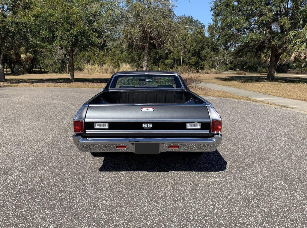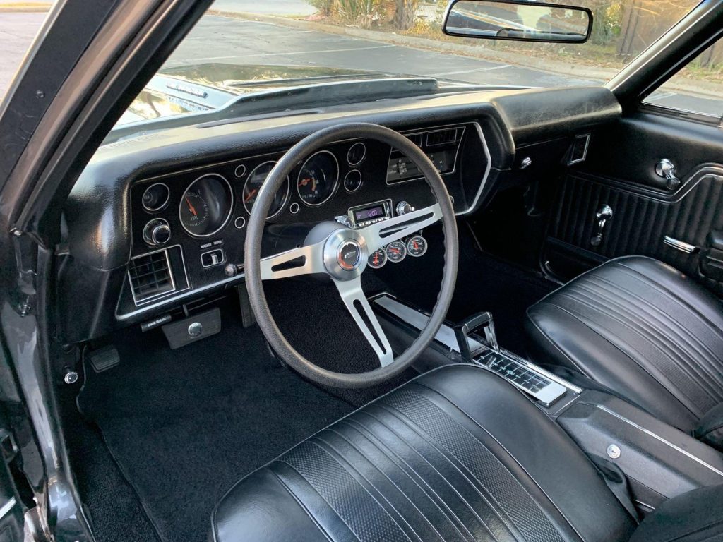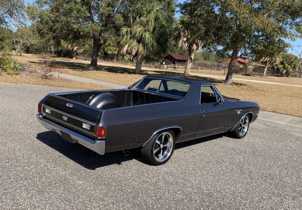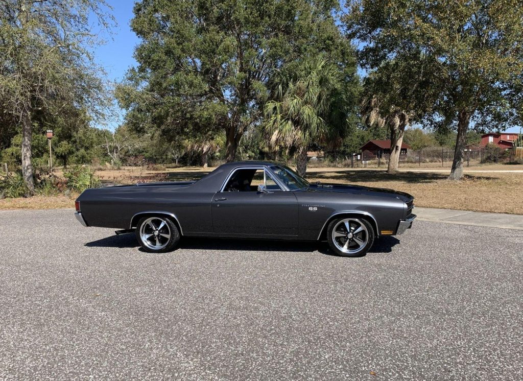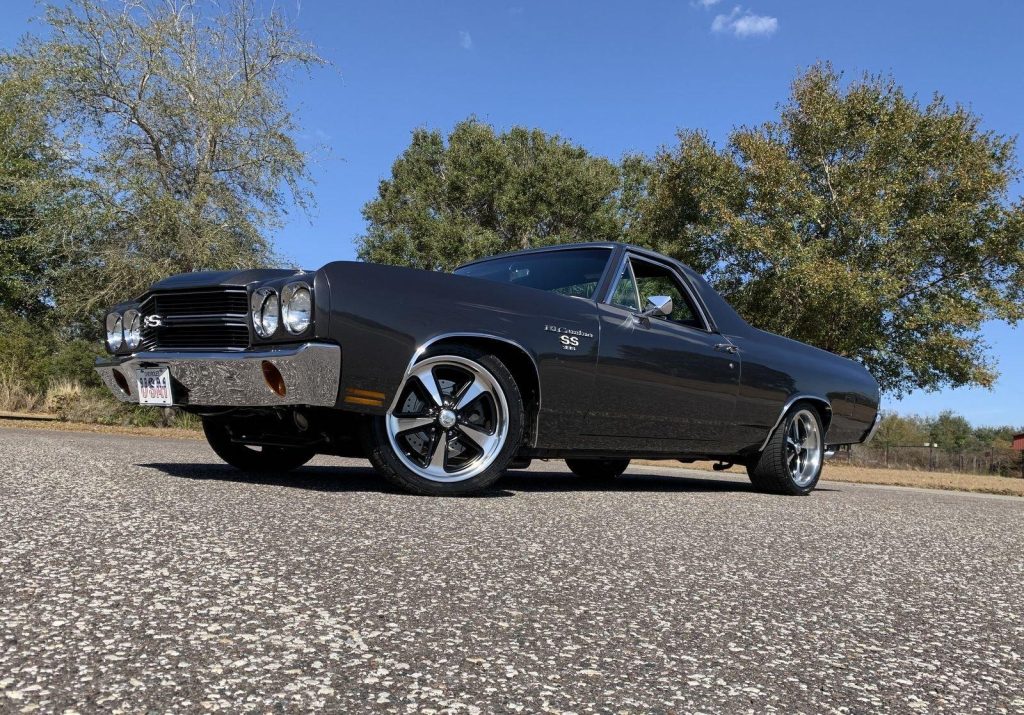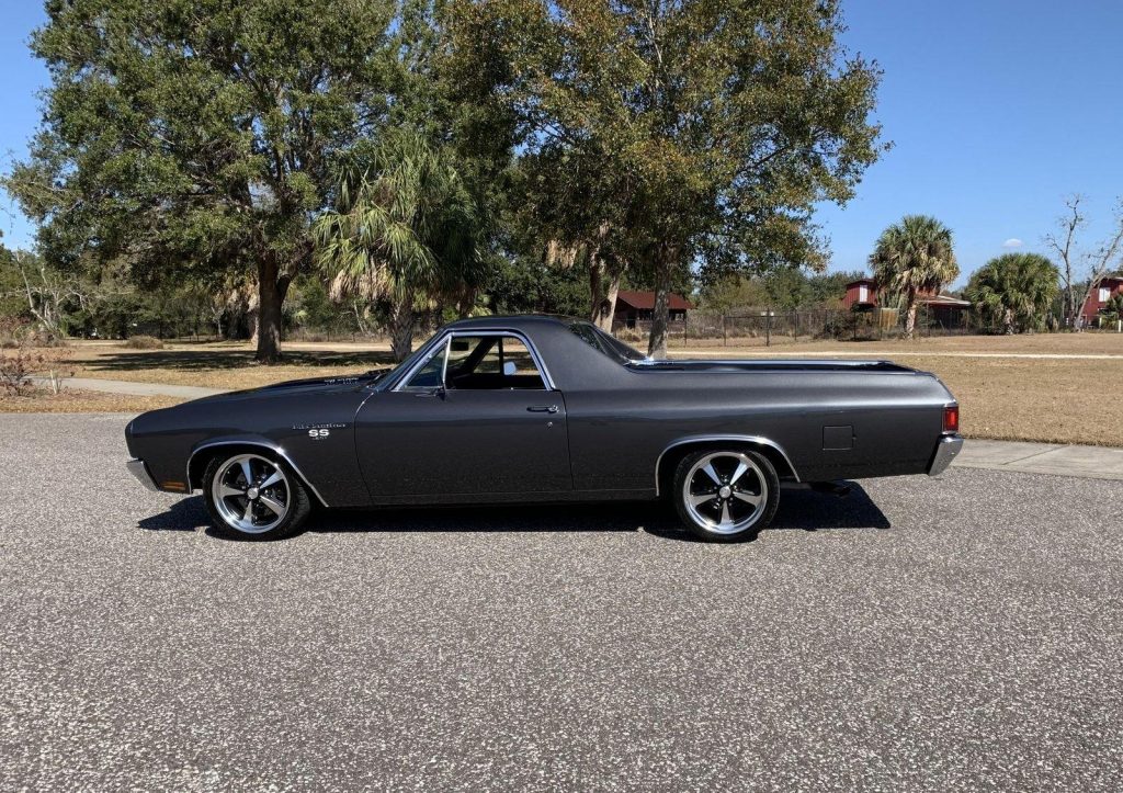 We are pleased to offer this 1970 Chevrolet El Camino Super Sport for Sale. Title shows actual miles. Aluminum Head GM 502 crate engine, Demon 4 barrel carburetor, ceramic coated headers, dual exhaust, MSD electronic ignition, BeCool Radiator, detailed engine bay, 700R4 automatic overdrive transmission, 12 bolt posi 3:73 rear end, serpentine pulleys, upgraded front suspension with adjustable upper control arms and tubular lowers, quick ratio steering box, power steering, front power disc brakes, 18” US Mag Wheels, 12 bolt rear end, upgraded Hotchkis rear suspension and sway bar, Cowl Hood with pins, Code 17 Shadow Gray exterior with black Rally Stripes, black bucket seat interior, center console, tachometer dash, auxiliary gauges, Retrosound Radio, Vintage Air Conditioning, deluxe steering wheel, reproduction owner’s book.