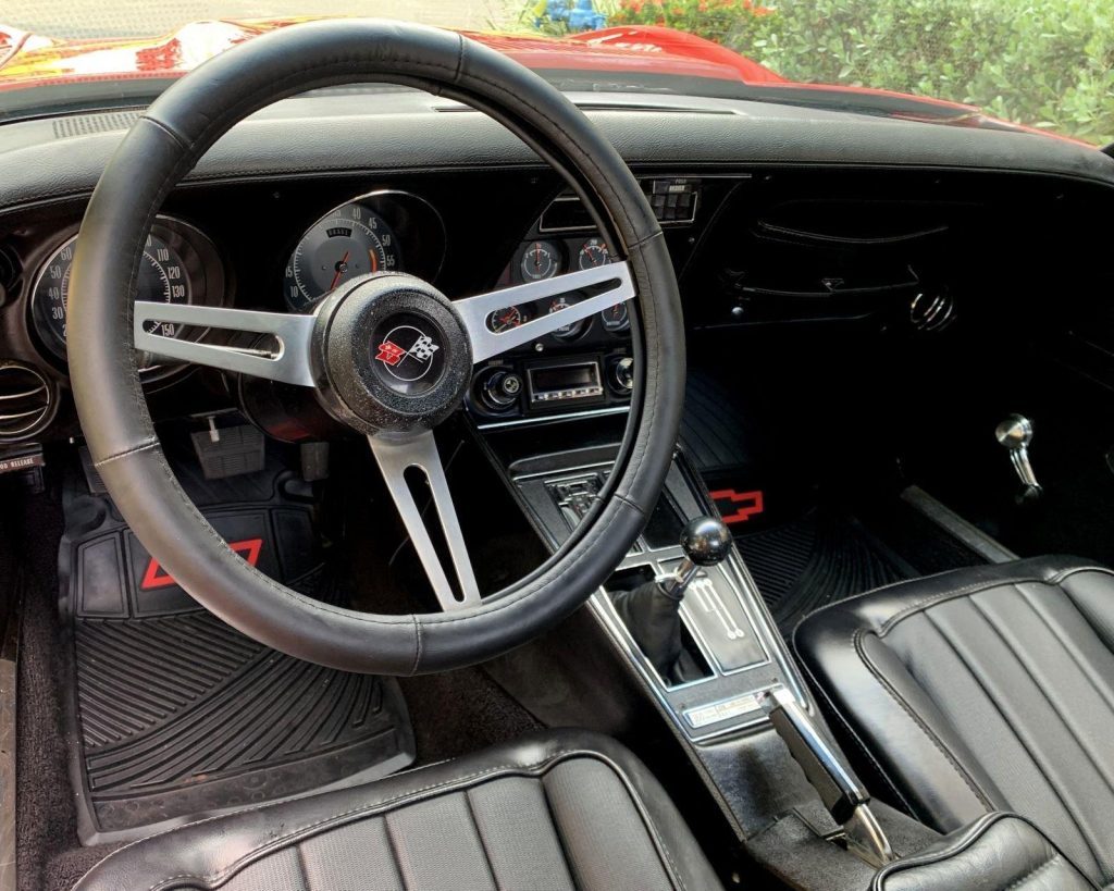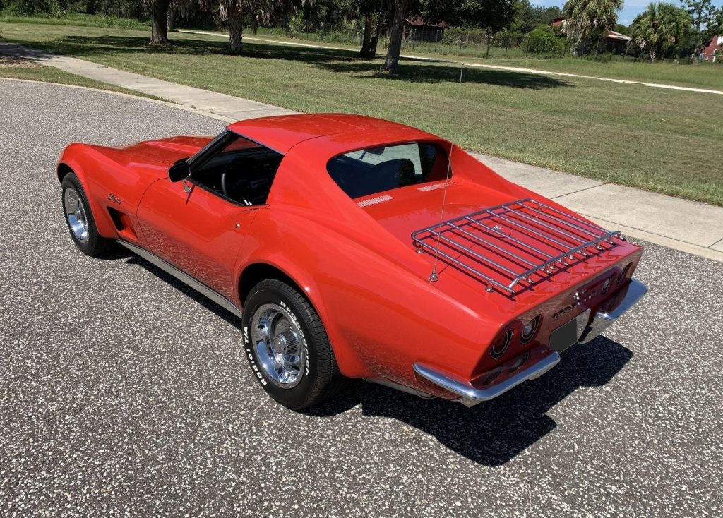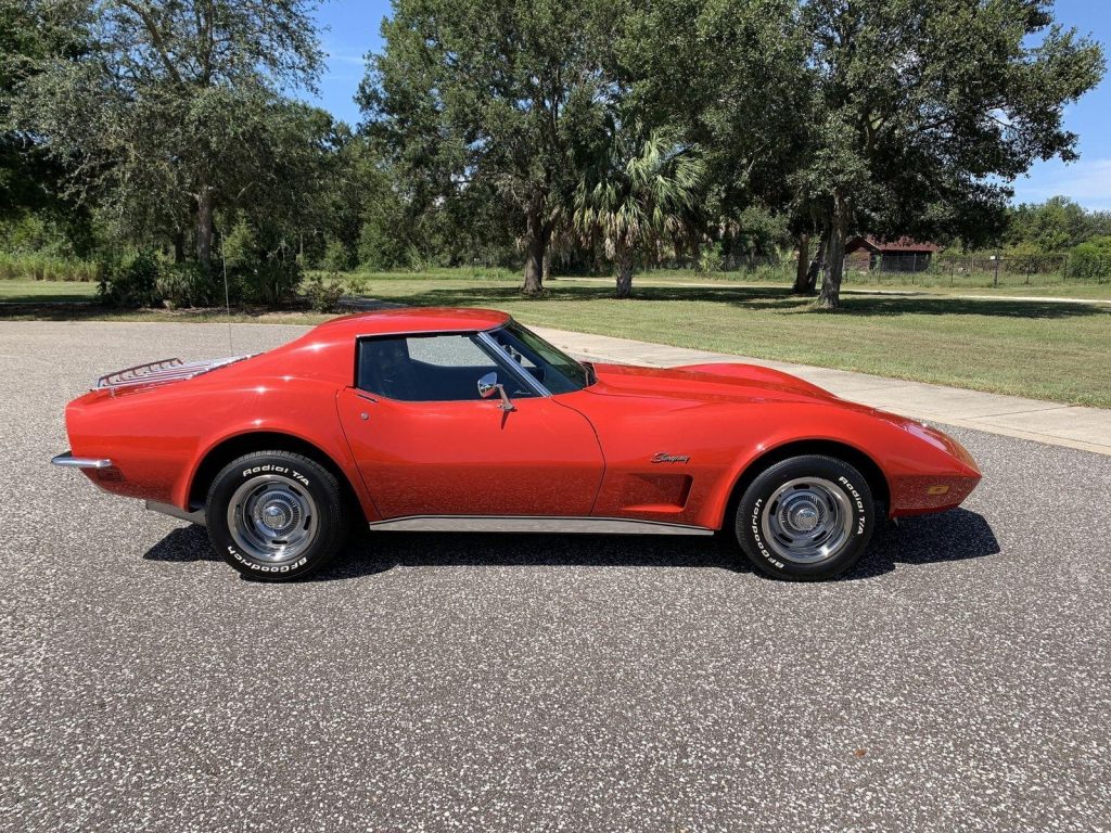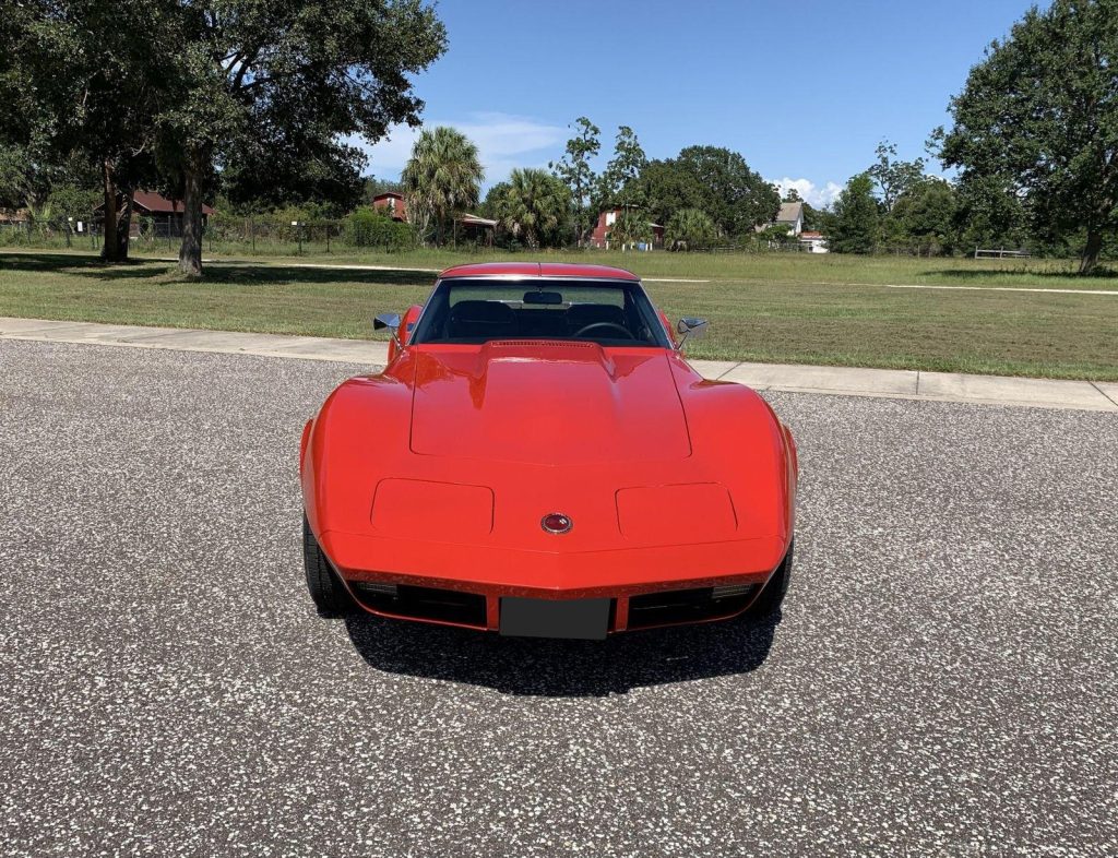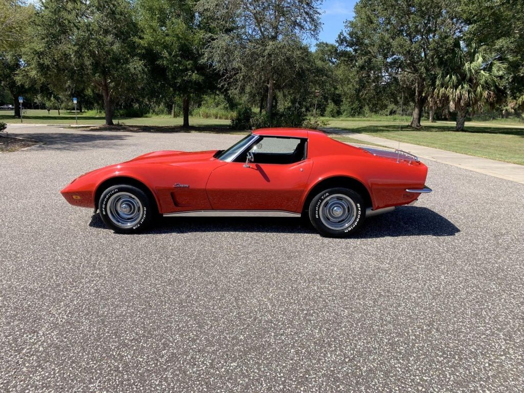 We are pleased to offer this 1973 Chevrolet Corvette for Sale. Numbers Matching 350 Cu In V8 engine block, upgraded Vortech Style cylinder heads by Summit, Quadrajet 4-barrel Carburetor, dual snorkel air cleaner, HEI electronic ignition, numbers matching Muncie 4 speed manual transmission, power steering, 4-wheel disc brakes, 15” Rally Wheels with 225/60/15 front and 235/60/15 rear tires, ceramic coated headers, dual exhaust, factory Code 976 Mille Miglia Red, working vacuum operated headlights, color keyed T-Tops, rear luggage…