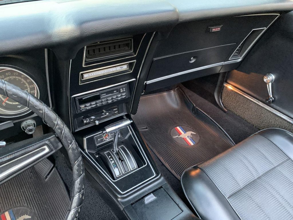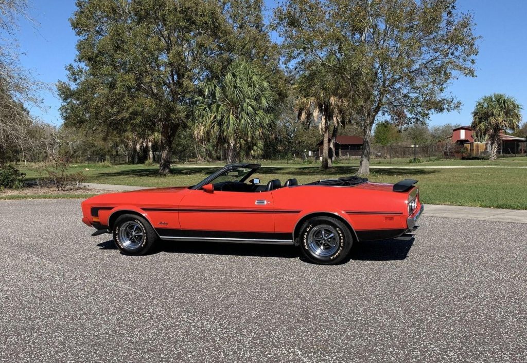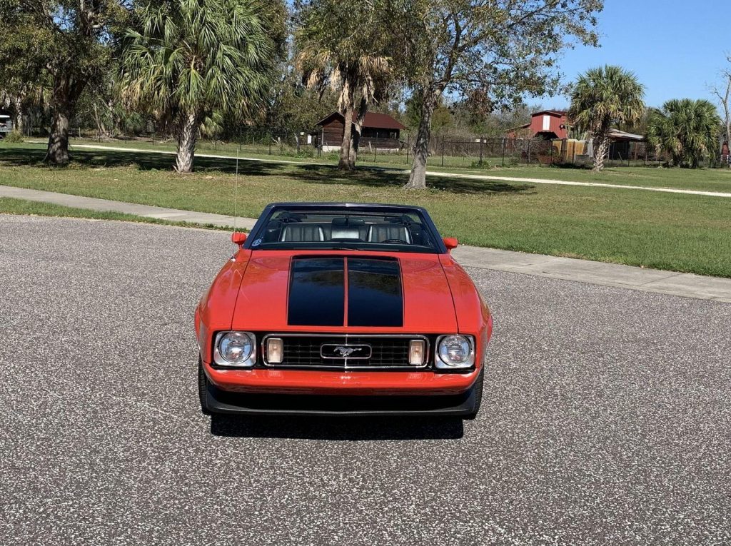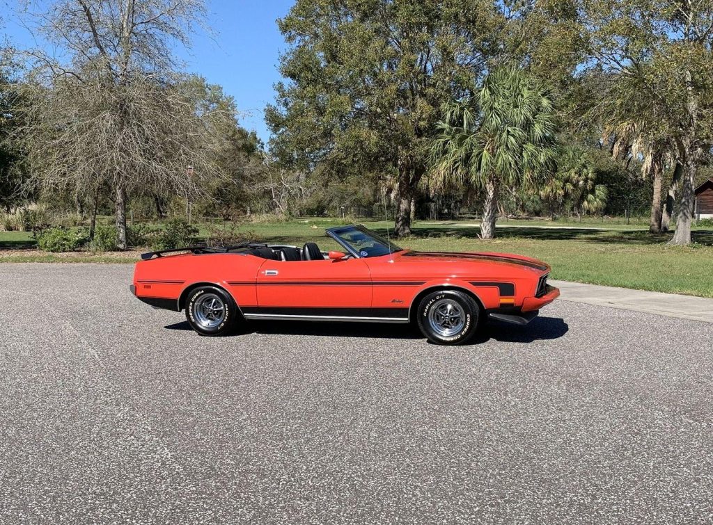 We are pleased to offer this 1973 Ford Mustang Convertible,with its numbers-matching 302 V8 and C4 automatic transmission. Equipped with power steering, power disc brakes, and 14” Magnum 500 wheels with Cooper white letter tires, this Mustang delivers both style and drivability. Finished in bright red with a black stripe package, rear deck spoiler, and black power convertible top with boot, it has a true muscle car presence. The interior features black knitted vinyl bucket seats, floor shifter, and AM/FM/Cassette radio, along with the original owner’s manual. A clean, well-kept classic Mustang, ready to cruise and enjoy.